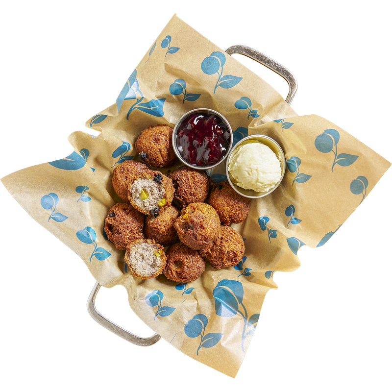 An original recipe, made with blue cornmeal and blueberry, our hushpuppies are served warm with honey butter & blueberry compote for dipping.An original recipe, made with blue cornmeal and blueberry, our hushpuppies are served warm with honey butter & blueberry compote for dipping.