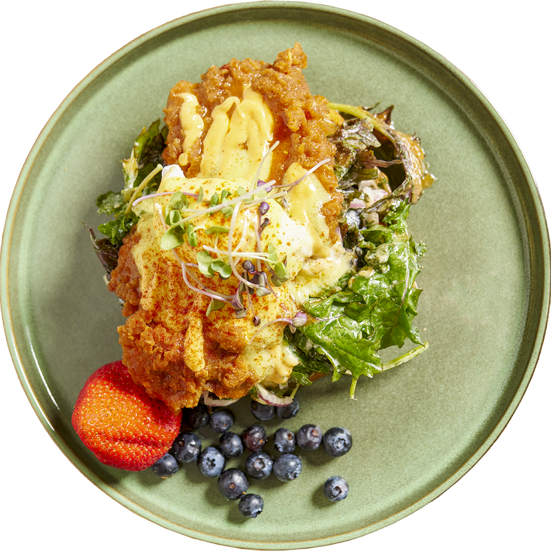 Spicy glazed chicken breast, fennel & kale dill slaw on toasted sourdough bread, one poached egg & topped with hollandaise sauce and drizzled with sriracha garlic crisp aioli. Served with choice of home fries, grits or fruit.Spicy glazed chicken breast, fennel & kale dill slaw on toasted sourdough bread, one poached egg & topped with hollandaise sauce and drizzled with sriracha garlic crisp aioli. Served with choice of home fries, grits or fruit.