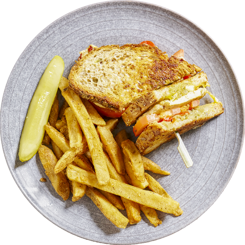 Grilled herb chicken breast, house cheese blend of fontina, gruyère, gouda, feta, cheddar-jack, sautéed caramelized onion and red pepper, pesto, beefsteak tomato, wheat bread, pickle spear.Grilled herb chicken breast, house cheese blend of fontina, gruyère, gouda, feta, cheddar-jack, sautéed caramelized onion and red pepper, pesto, beefsteak tomato, wheat bread, pickle spear.