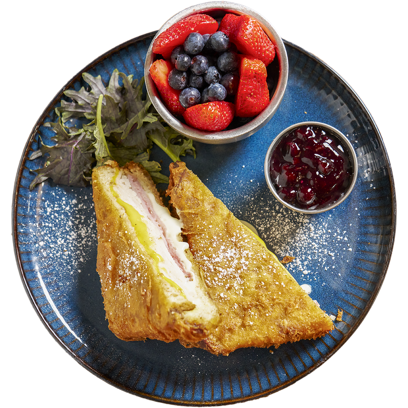 Smoked pit ham, smoked turkey breast, american & swiss cheeses, battered & fried until golden. Topped with powdered sugar & served with berries & triple-berry compote on the side.Smoked pit ham, smoked turkey breast, american & swiss cheeses, battered & fried until golden. Topped with powdered sugar & served with berries & triple-berry compote on the side.