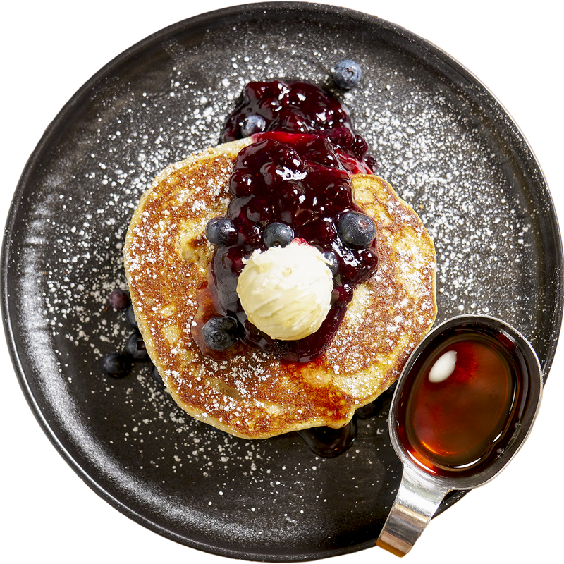 Fluffy pancakes filled with fresh blueberries, served with butter and warm syrup.Fluffy pancakes filled with fresh blueberries, served with butter and warm syrup.